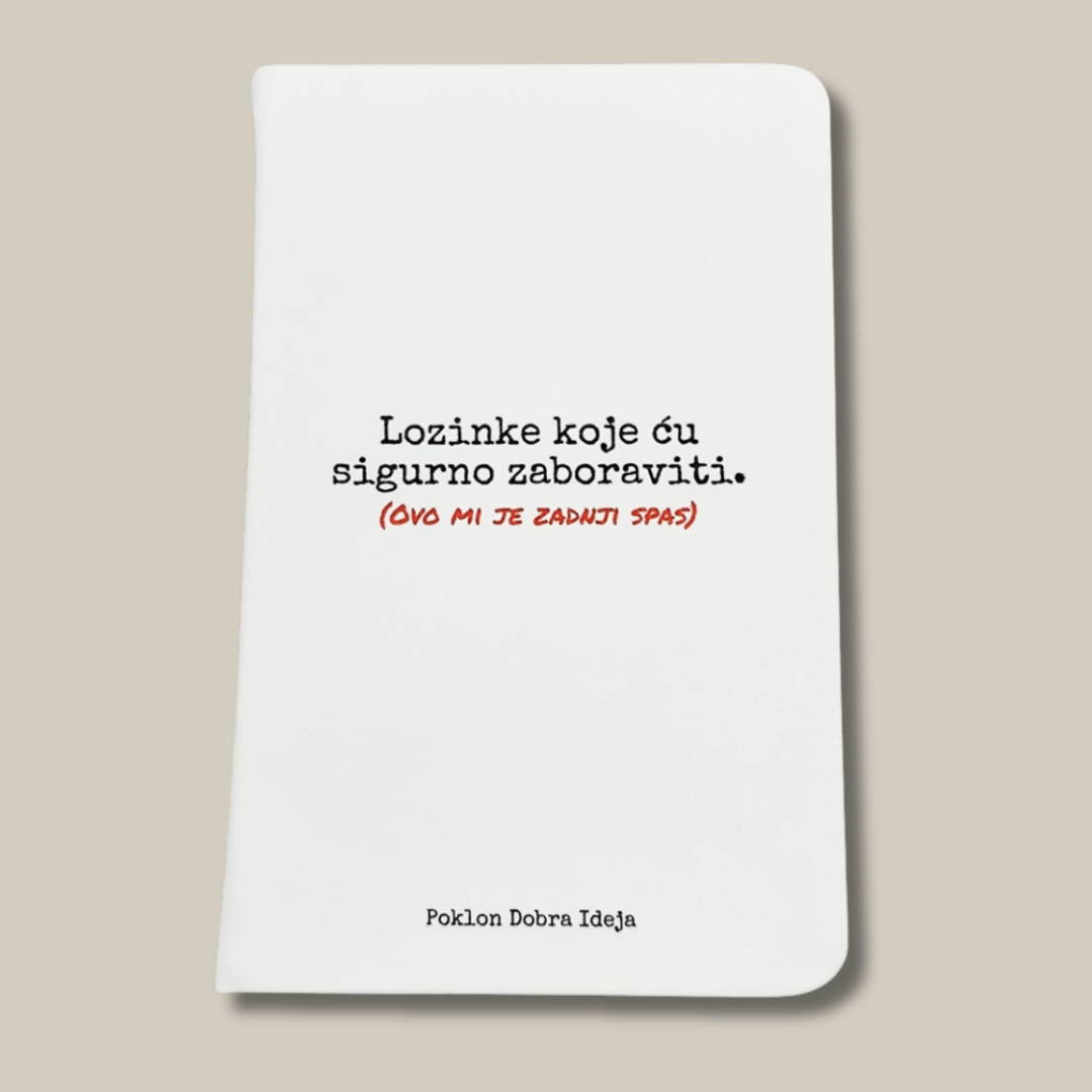 Bilježnica za zapisivanje lozinki s natpisom Lozinke koje ću sigurno zaboraviti