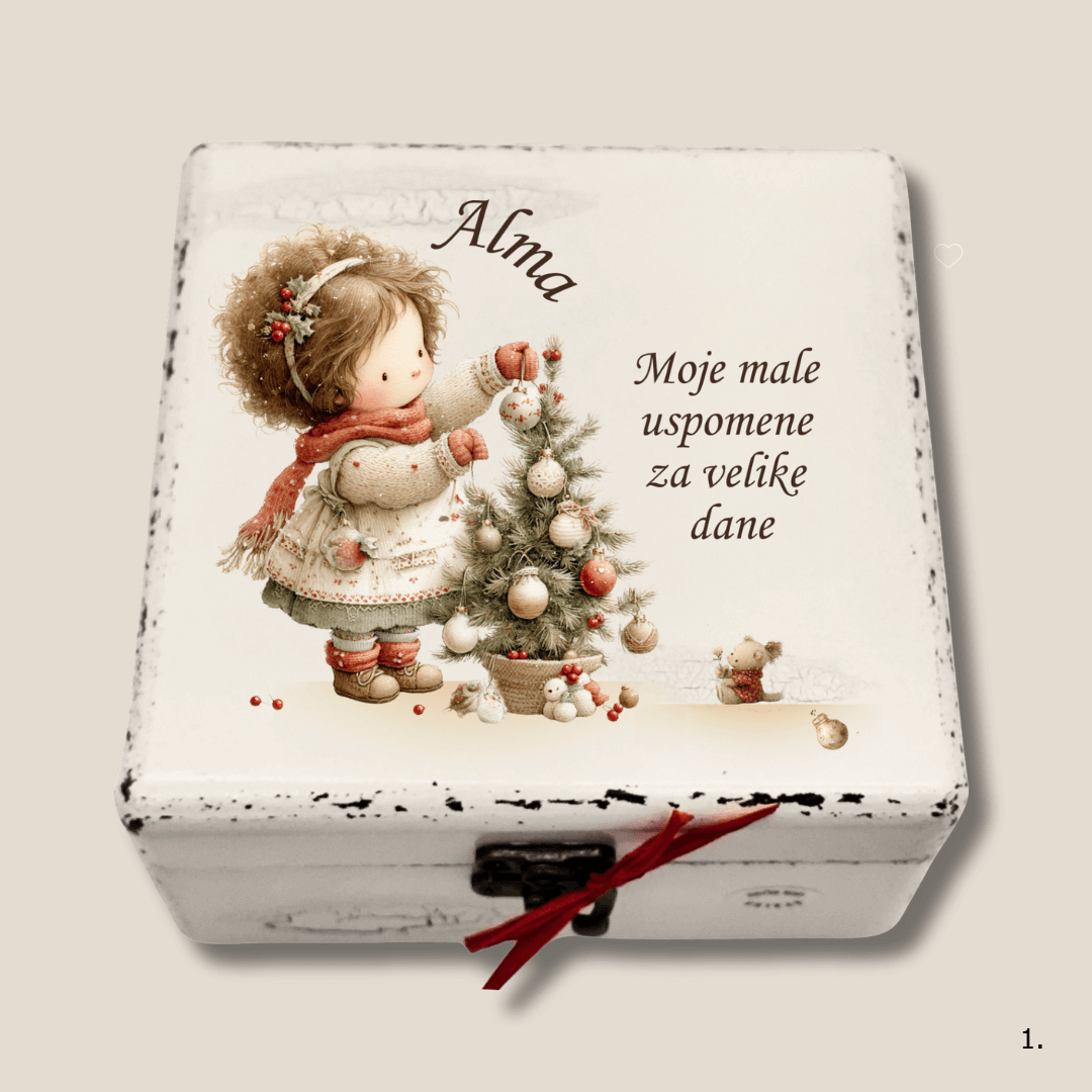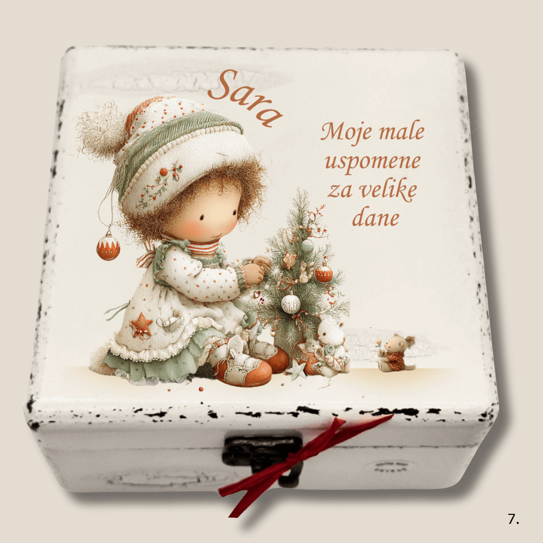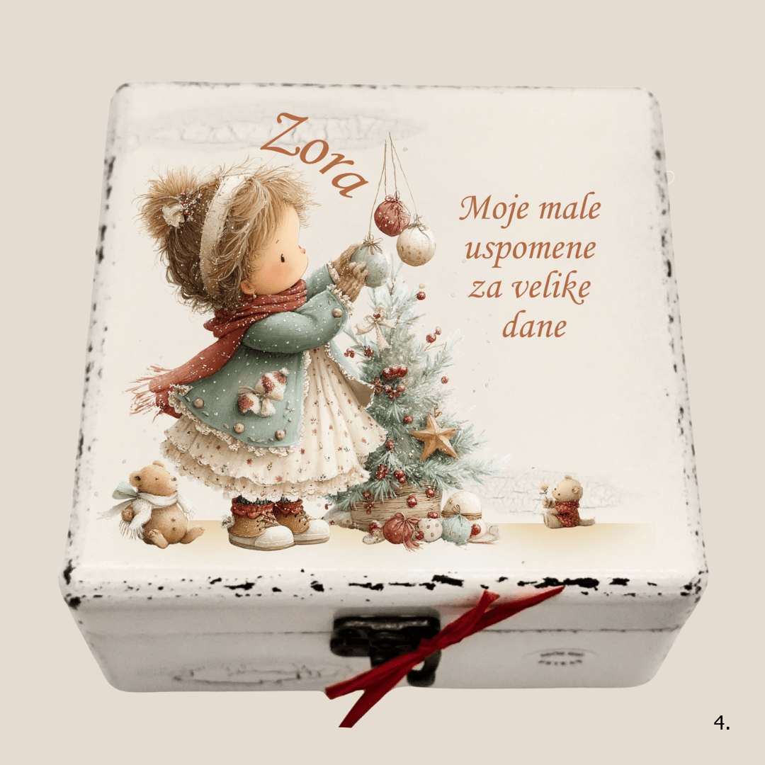 Personalizirana božićna kutija uspomena s likom djevojčice Zore i božićnog drvca – ručni rad Poklon Dobra Ideja.