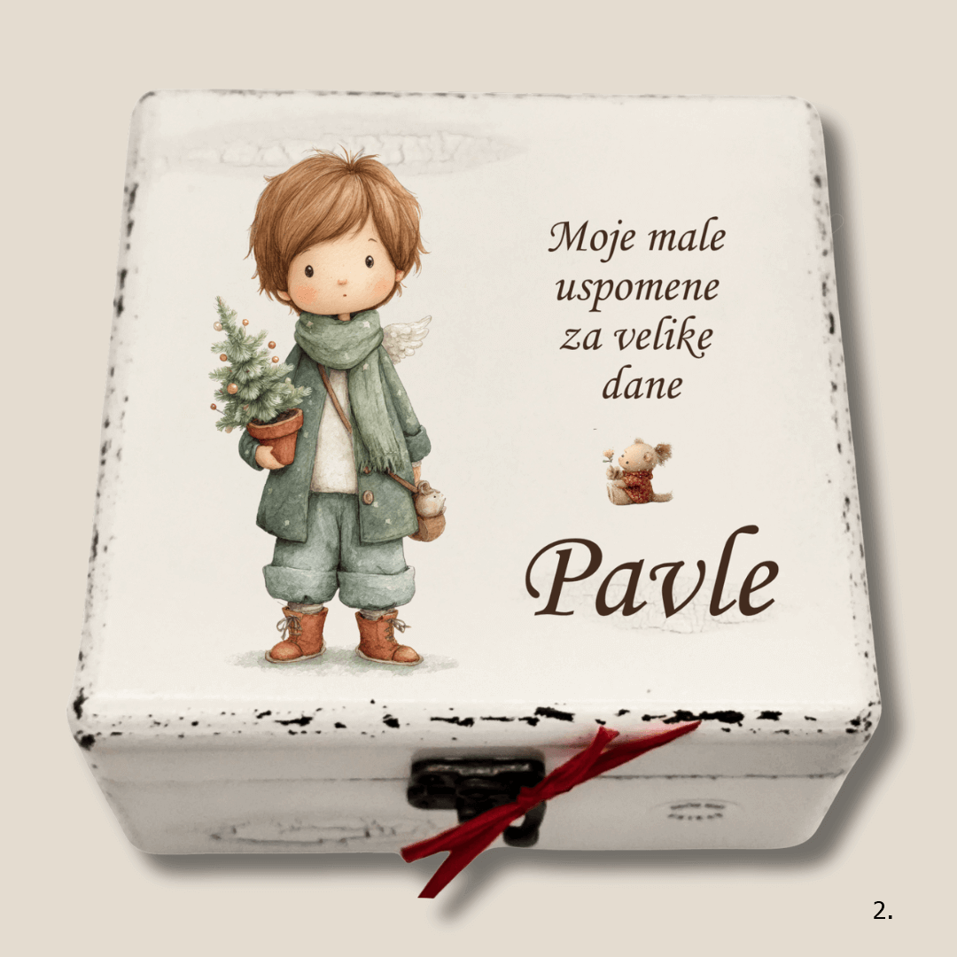 Božićna kutija uspomena za dječaka s anđelom i borom – ime Pavle, tekst “Moje male uspomene za velike dane”, ručni rad.