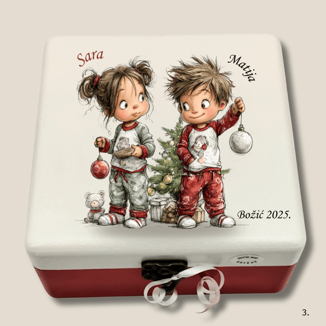 Personalizirana božićna kutija uspomena za dvoje djece – Sara i Matija, ilustracija djece uz bor, tekst Božić 2025.
