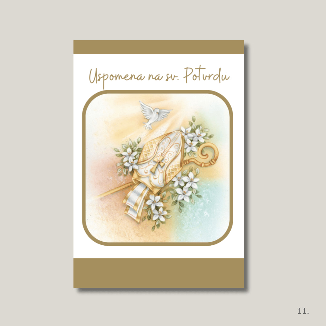 Uspomena na svetu potvrdu – biskupski štap, golubica i cvjetni motivi, simbol sakramenta krizme