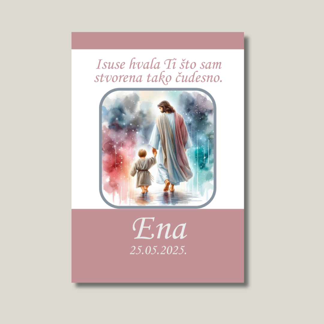 Magnet za pričest Isus drži djevojčicu za ruku šarenu pozadinu