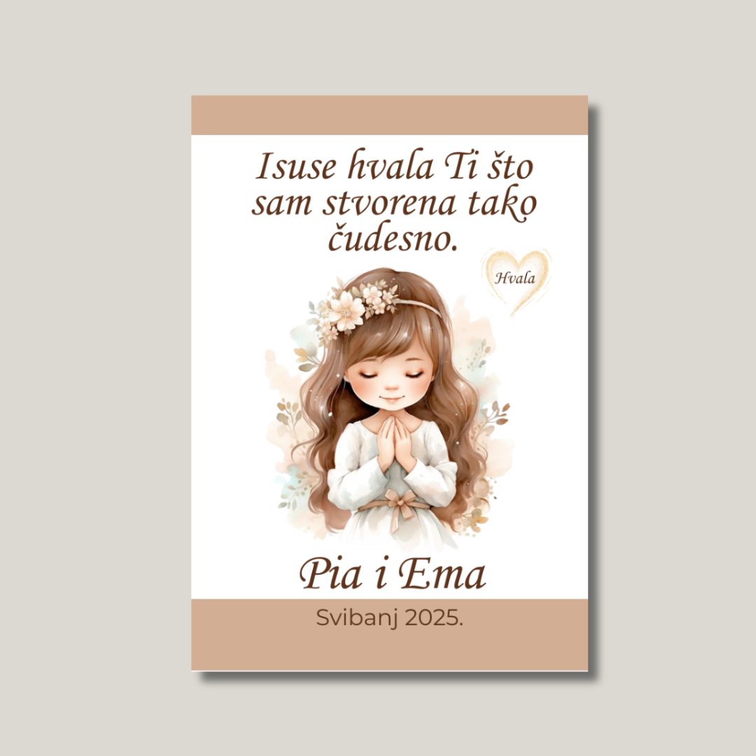 Zahvalnica za prvu pričest djevojčice s cvjetnim vjenčićem koja moli
