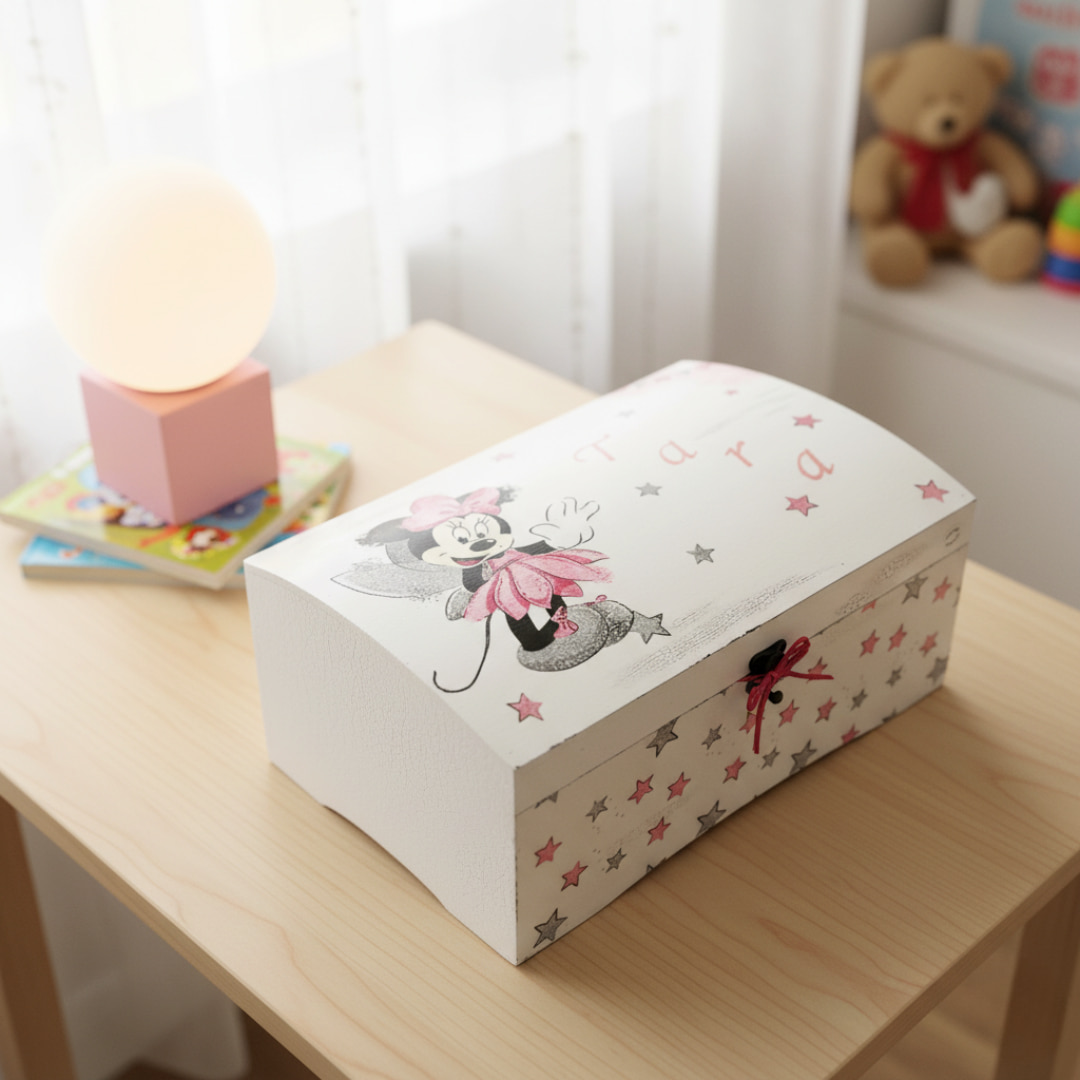 Izrađena od čvrstog MDF drva, idealna je za čuvanje prvih narukvica iz rodilišta, fotografija, čestitki, peludnih medaljica ili simboličnih sitnica.