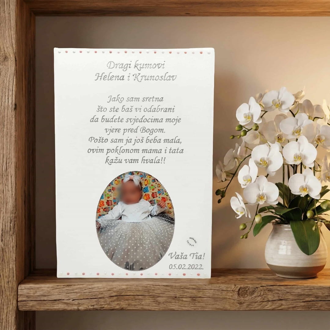 Početna Pokloni za krštenje i rođenje djeteta Personalizirana slika za krsne kumove – trajna uspomena s porukom i fotografijom
