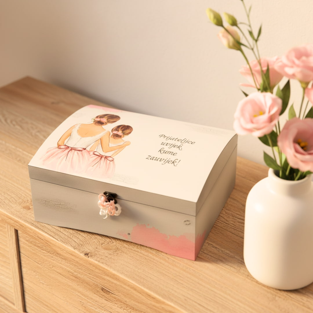 Proizvod vrijedan svakog novcica! Lijepo, decentno, veliko i svaka kumica ce biti sretna sto je dobila na poklon ovu kutiju! Mozete sami odrediti kakav uzorak cvijeca ce biti na kutiji. ?