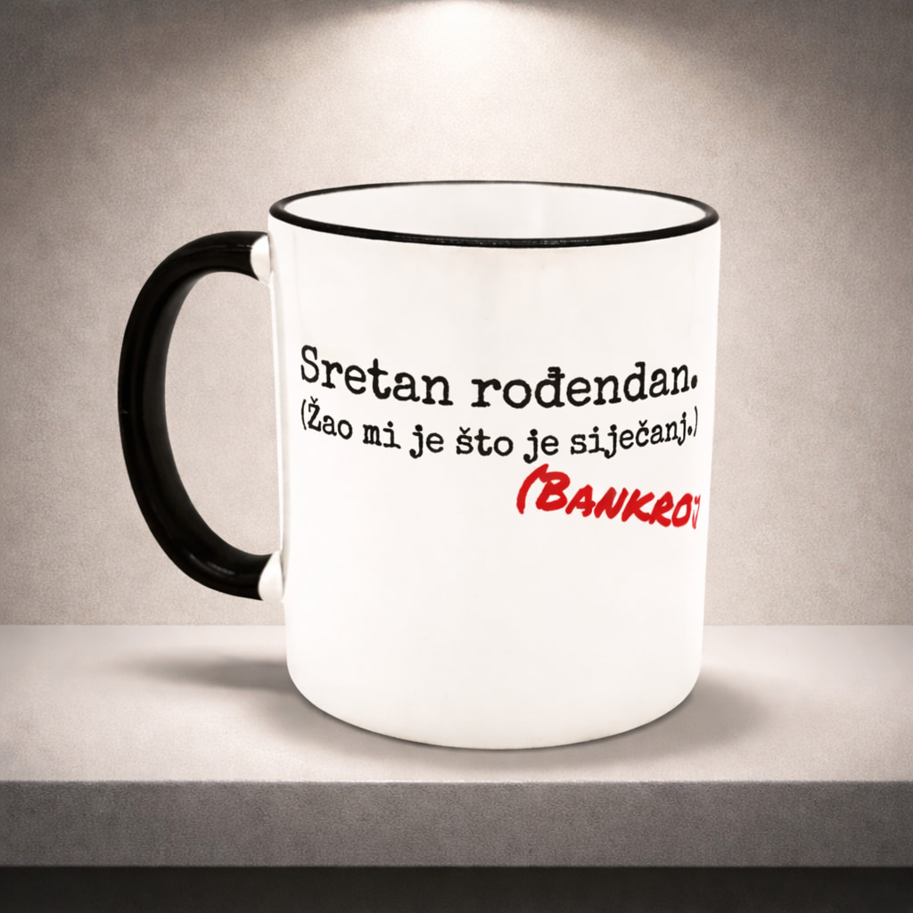 Smiješna rođendanska šalica s natpisom Sretan rođendan žao mi je što je siječanj bankrot sam.
