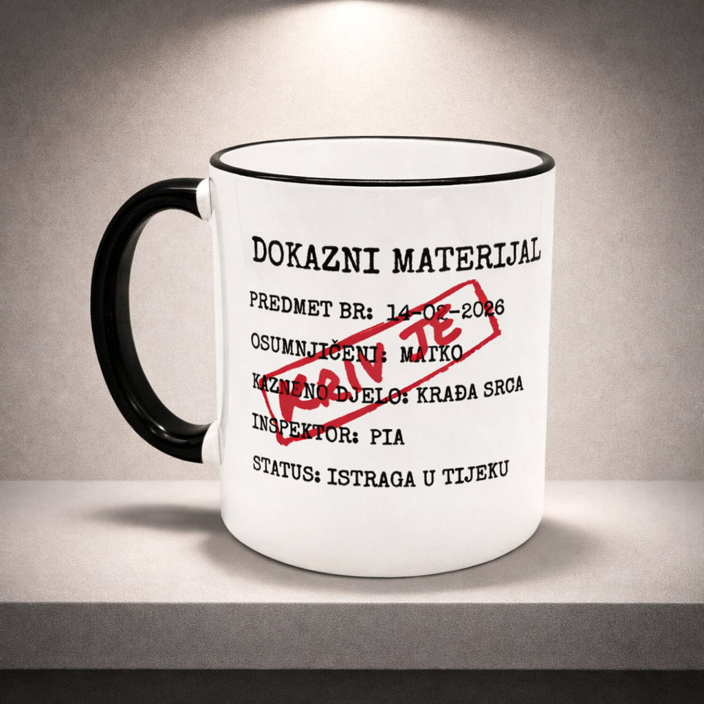 Kod motiva “Dokazni materijal”, u polje za personalizaciju upišite ime osobe kojoj poklanjate šalicu, a mi ćemo ga uklopiti u dizajn policijskog pečata.