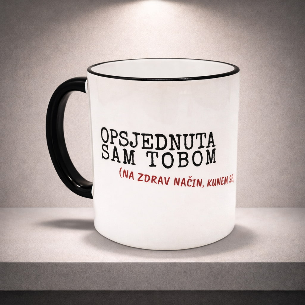 Bijela šalica s crnom ručkom i smiješnim natpisom Opsjednuta sam tobom kao poklon za Valentinovo