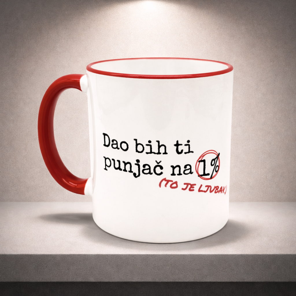 Bijela šalica s crvenom ručkom i natpisom Dao bih ti punjač na 1% to je ljubavni poklon za Valentinovo.