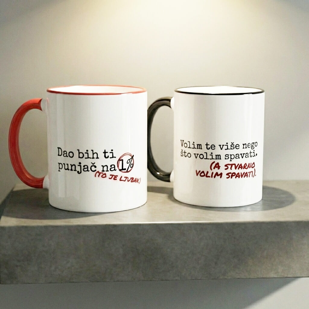 Set od dvije keramičke šalice jedna s crvenom ručkom i natpisom Dao bih ti punjač na 1% a druga s crnom ručkom i natpisom Volim te više nego što volim spavati.