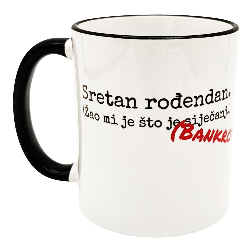 Smiješna rođendanska šalica s natpisom Sretan rođendan žao mi je što je siječanj bankrot sam.