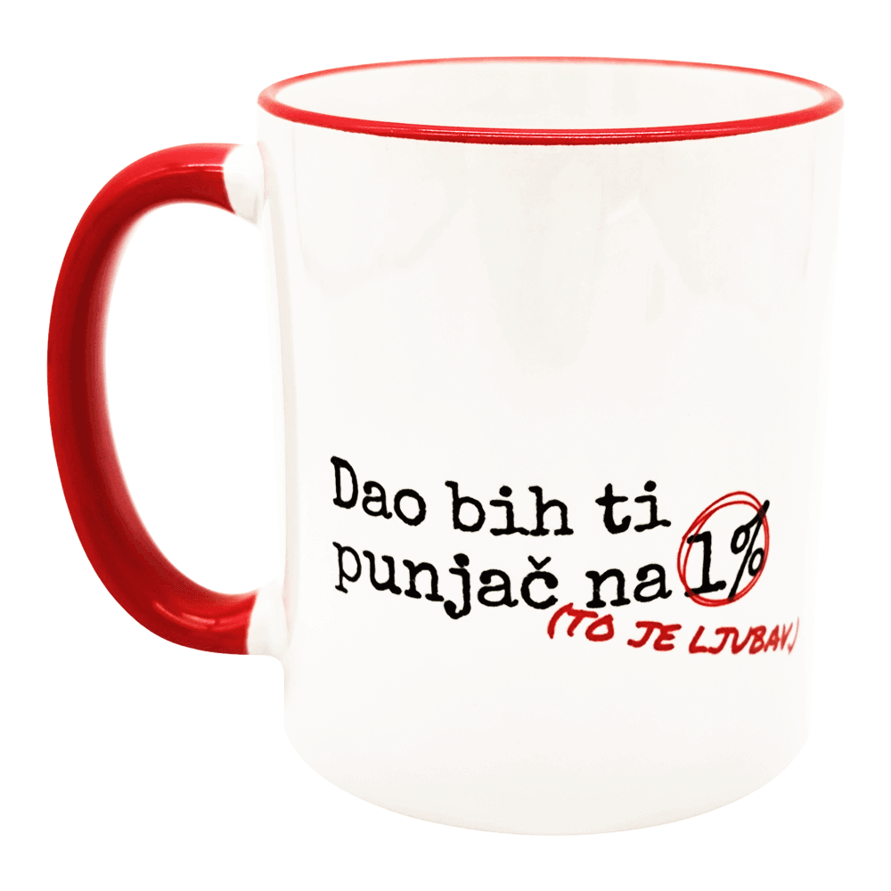 Bijela šalica s crvenom ručkom i natpisom Dao bih ti punjač na 1% to je ljubavni poklon za Valentinovo.